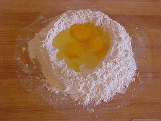- Sift the flour and salt together onto a clean work surface. Use your hands to shape the flour into a circular mound. Make a well in the centre. Place the eggs in the well and use a fork to lightly whisk. Use your fingertips to gradually blend a little flour into the egg mixture. Working with your fingertips, continue to gradually draw the flour into the centre (being careful the egg mixture does not run out of the well) until the mixture forms a dough. To check if the dough is the right consistency, press a clean, dry finger into the centre of the dough. If it comes out clean without being sticky, it is the right consistency. If not, knead in a little more flour and test again.